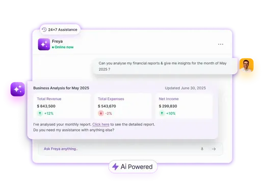 While the system automates bookkeeping, Freya gives you instant answers to accounting questions. Instead of digging through reports, Freya turns your financial data into clear, conversational answers, helping you understand trends and surface insights in seconds.