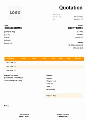 A quote template is a document created by the seller for the potential buyer describing the product or service details that they are going to offer with the price. It is a type of estimate document where the buyer adds all the details related to the product or service like product name, rate, description, applicable tax and discounts. Once the quote is accepted by the buyer, you can easily convert the quote to an invoice with one click.